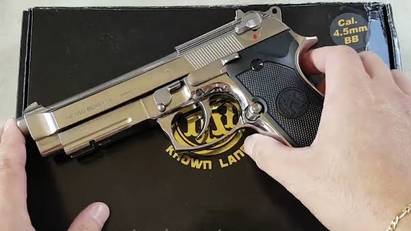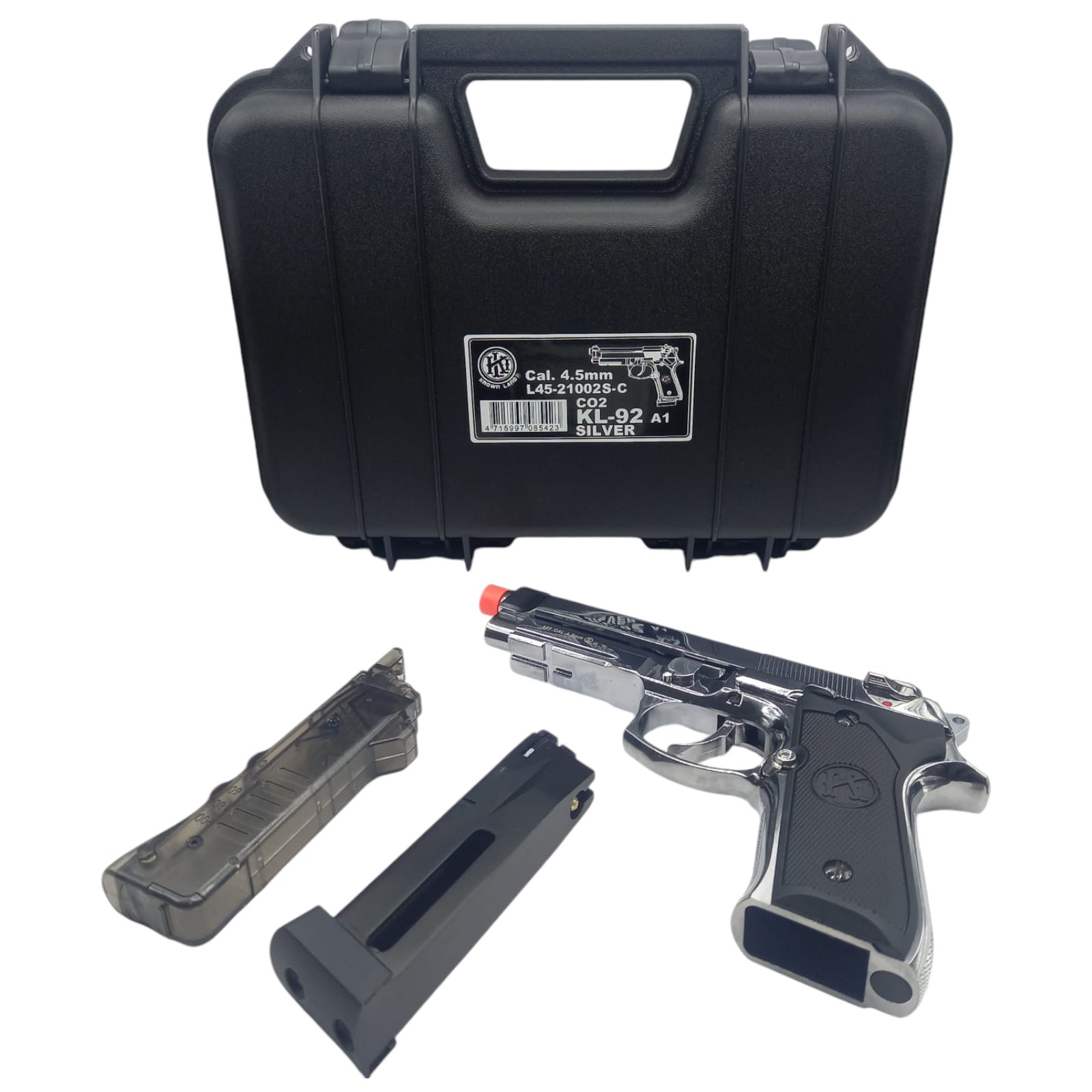 Simplesmente linda: A Pistola Beretta KL92 cromada é uma das pistolas mais cobiçadas do mundo e finalmente está disponível em uma versão airgun Co2, isso é, uma pistola de pressão full metal, blowback, cromada e totalmente realista.